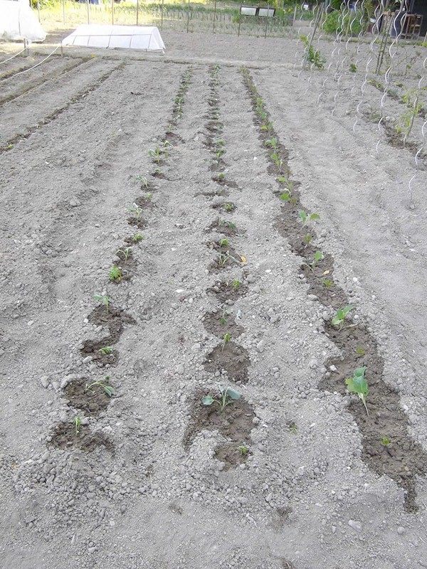 J'ai bien travaillé cet après midi ! J'ai repiqué 21 choux fleurs et 13 brocoli sur deux rangs à côté de mes choux de milan !